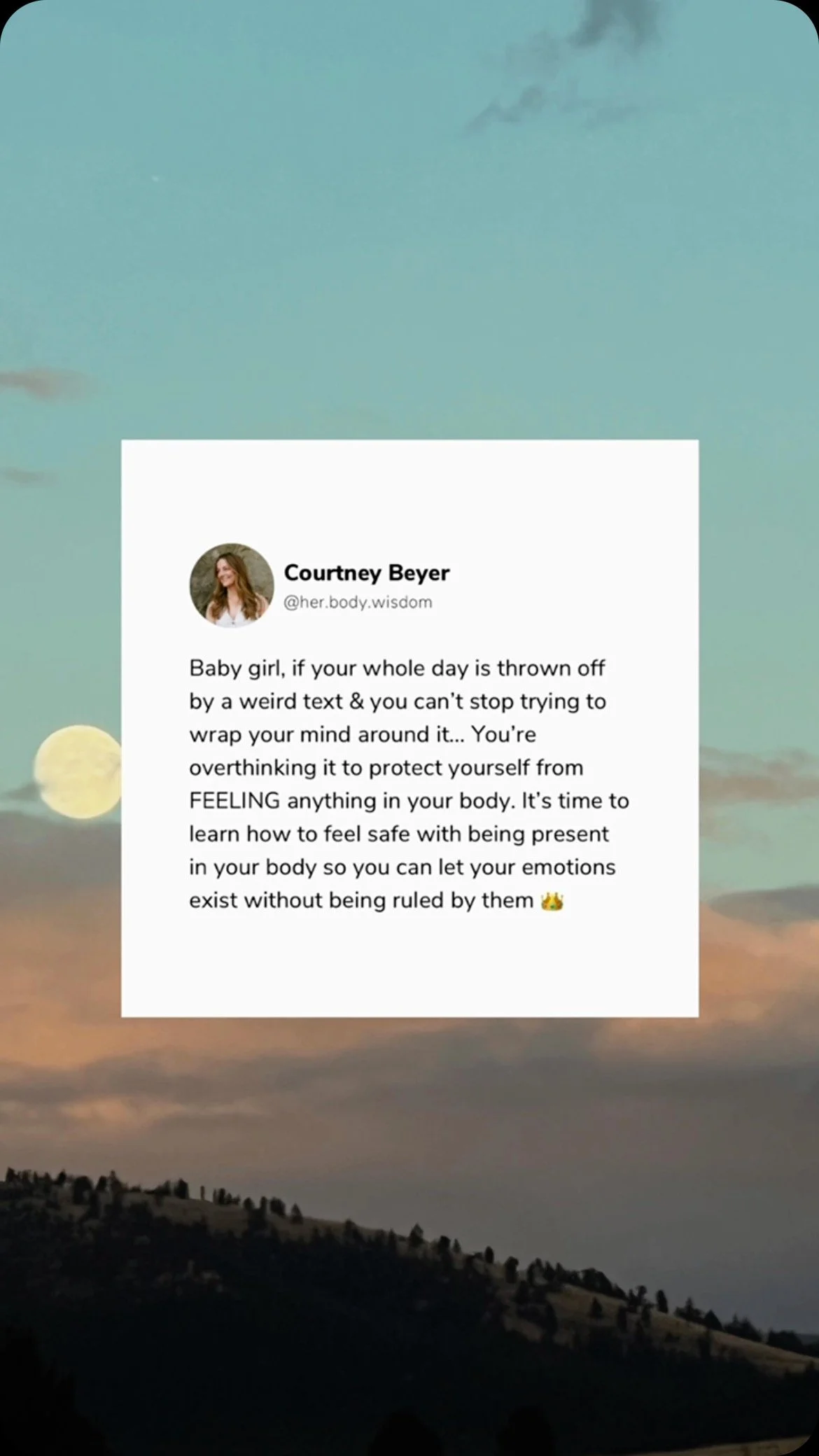 You’ll learn how to lovingly support your nervous system so your body can move out of survival mode and into safety. Instead of being at the mercy of big emotions, you’ll feel a steady calm within you. from that place—everything shifts: